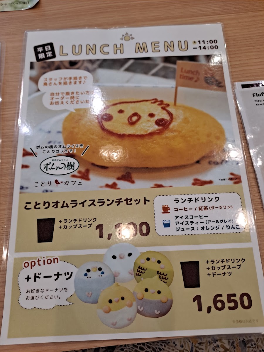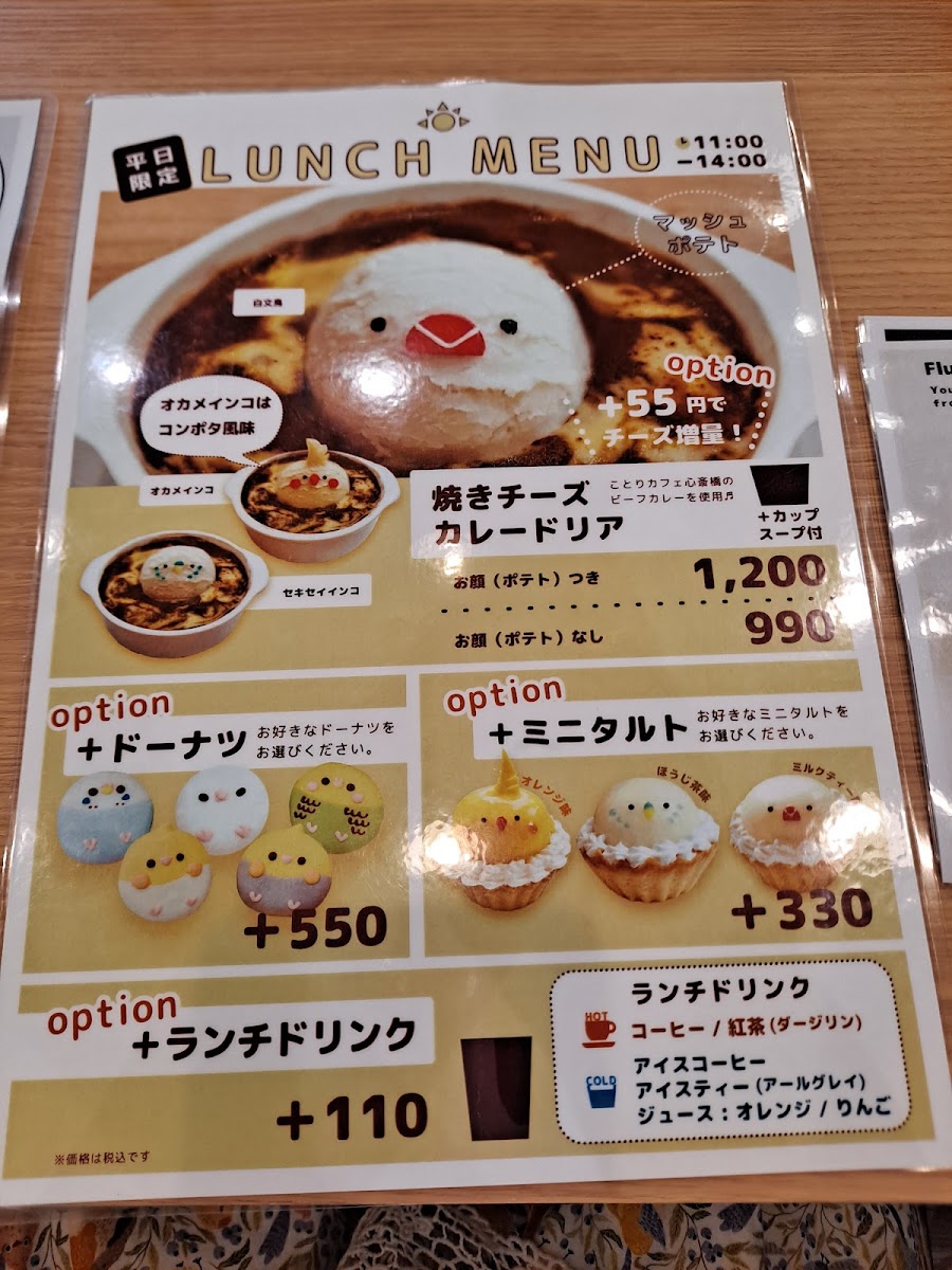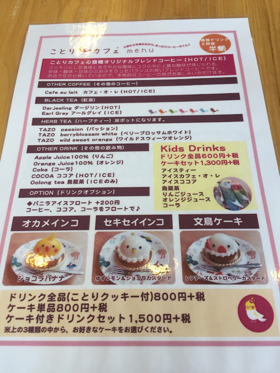 Kotori Smile offers a delightful selection of drinks and experiences that truly capture the essence of joy and warmth. For a sweet treat, the ショコラショー (Chocolat Show) is a must-try, offering a rich, indulgent chocolate experience. If you're in the mood for something unique and festive, the HappyValentine drink brings a fun, seasonal twist, perfect for special occasions. For those looking for a bit of interactive fun, the ふれあい体験/1回15分 (Fureai Taiken - 15-minute experience) provides an engaging and memorable hands-on activity, allowing guests to enjoy a brief yet enriching experience. Whether you're sipping on a decadent chocolate drink or participating in a short, enjoyable activity, Kotori Smile’s menu ensures a blend of indulgence and engagement, making it a perfect spot for both relaxation and light-hearted entertainment.